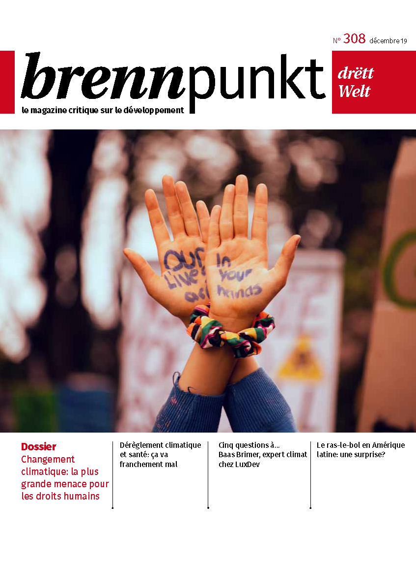 La nouvelle édition du Brennpunkt Drëtt Welt vient d’être publiée avec son dossier spécial « Changement climatique: la plus grande menace pour les droits humains »: « Le monde n‘a jamais vu une menace de cette ampleur pour les droits humains. Les économies de toutes les nations, le tissu institutionnel, politique, social et culturel de chaque État et les droits de tous vos peuples – et des générations futures – seront touchés. » Lors de son discours d’ouverture de la 42ème session du Conseil des droits de l’Homme, la Haute Commissaire des Nations Unies pour les droits humains, Michelle Bachelet, a mis les Etats en garde : le changement climatique constitue la plus grande menace pour les droits humains…