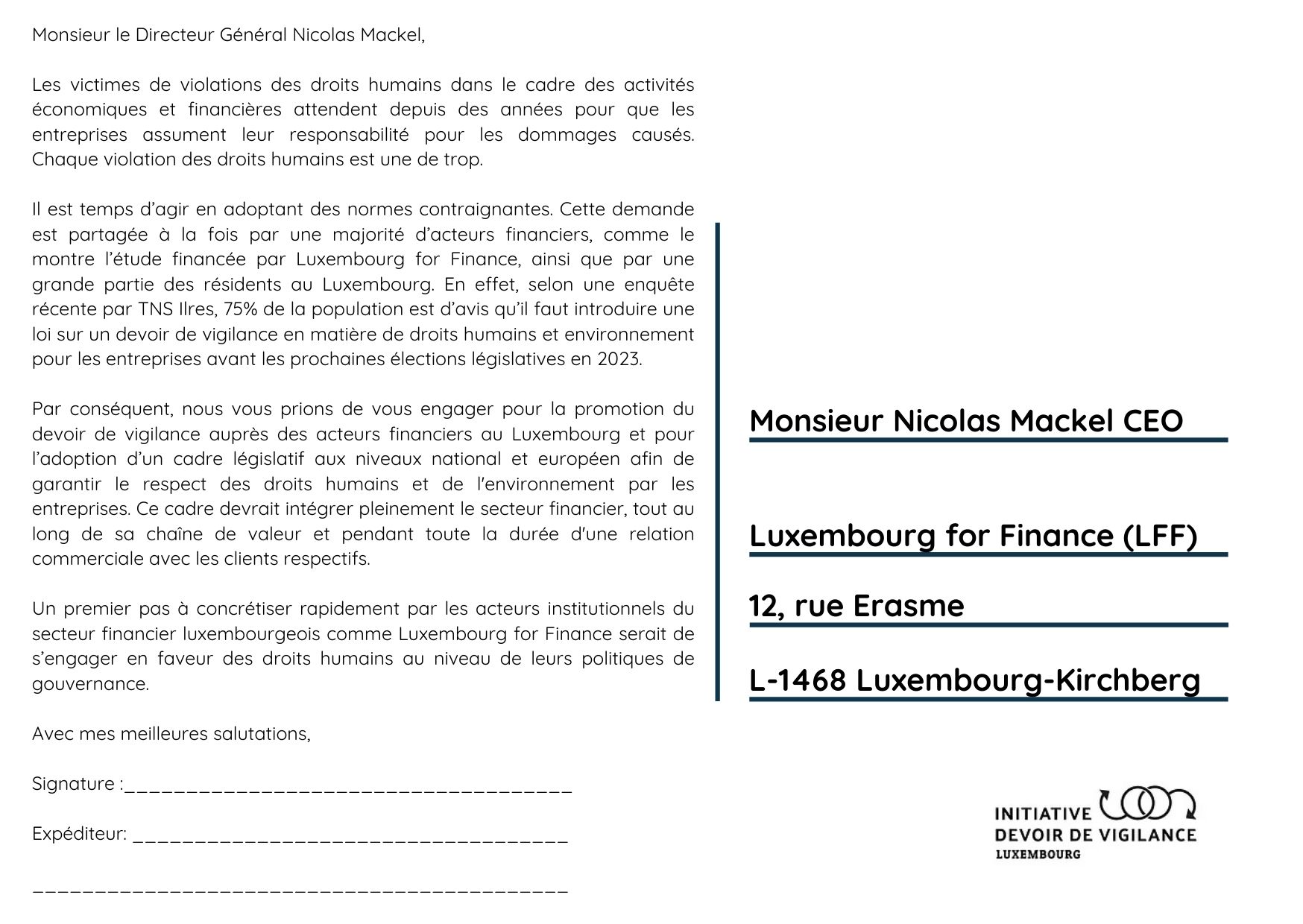Aidez-nous à demander au directeur général de Luxembourg for Finance Nicolas Mackel de promouvoir la diligence raisonnable et l’adoption d’une telle législation au niveau national et européen!
