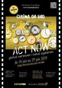 Konsortium Cinéma du Sud, an dem auch Action Solidarité Tiers Monde- ASTM beiteiligt ist, in seiner 10. Ausgabe im Sommer und Herbst 2019. Es geht darum, gemeinsam mit anderen Menschen ökologische und soziale Alternativen zu entdecken, um eine nachhaltigere Welt für alle zu schaffen: „Act Now – Global verstoen. Lokal agéieren.“